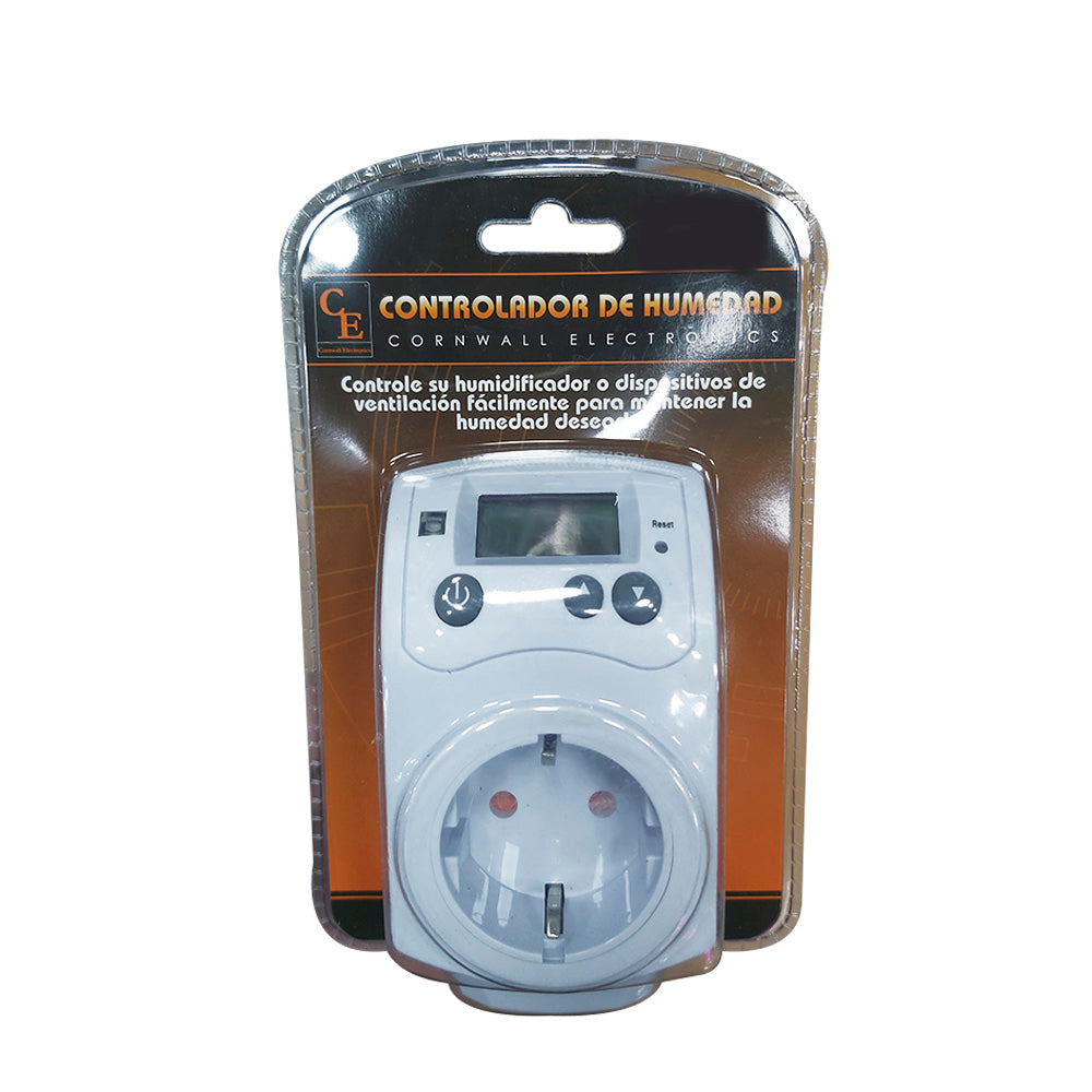 Permite controlar un extractor en función del grado de humedad relativa seleccionado. Dispone de dos funciones, modo control humidificador y modo control deshumidificador, cualquiera de los dos dispositivos puede ser conectado al controlador. Es digital y visualiza la lectura de la humedad de la estancia, pudiendo ejercer un control eficaz del humidificador/deshumidificador que esté conectado en ese momento.