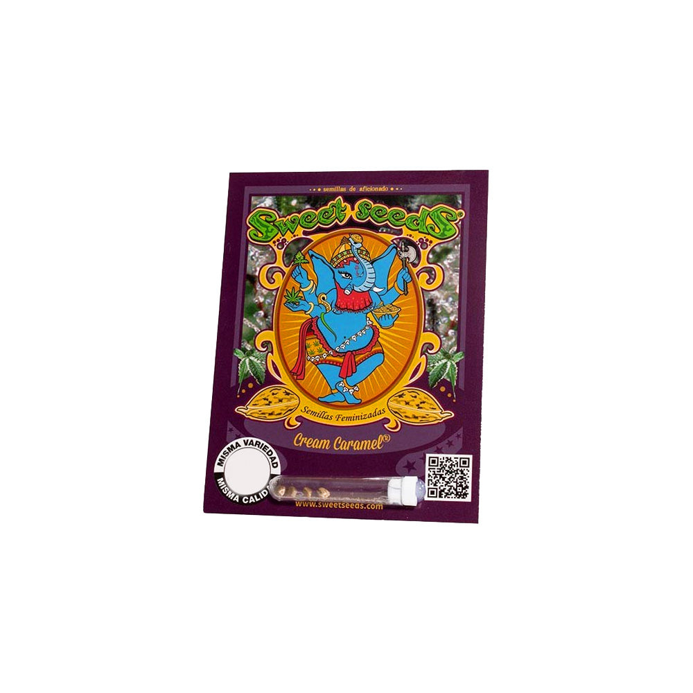 Cream Caramel® es una variedad clásica de la colección genética de Sweet Seeds®, fruto del cruce entre Blue Black, Maple Leaf Indica y White Rhino. Reconocida y premiada internacionalmente, destaca por su intenso sabor dulce y acaramelado con matices terrosos. Con estructura compacta de índica clásica, es ideal para interior y exterior, y una favorita entre los coleccionadores de genéticas mayormente índica, por sus potentes efectos relajantes.