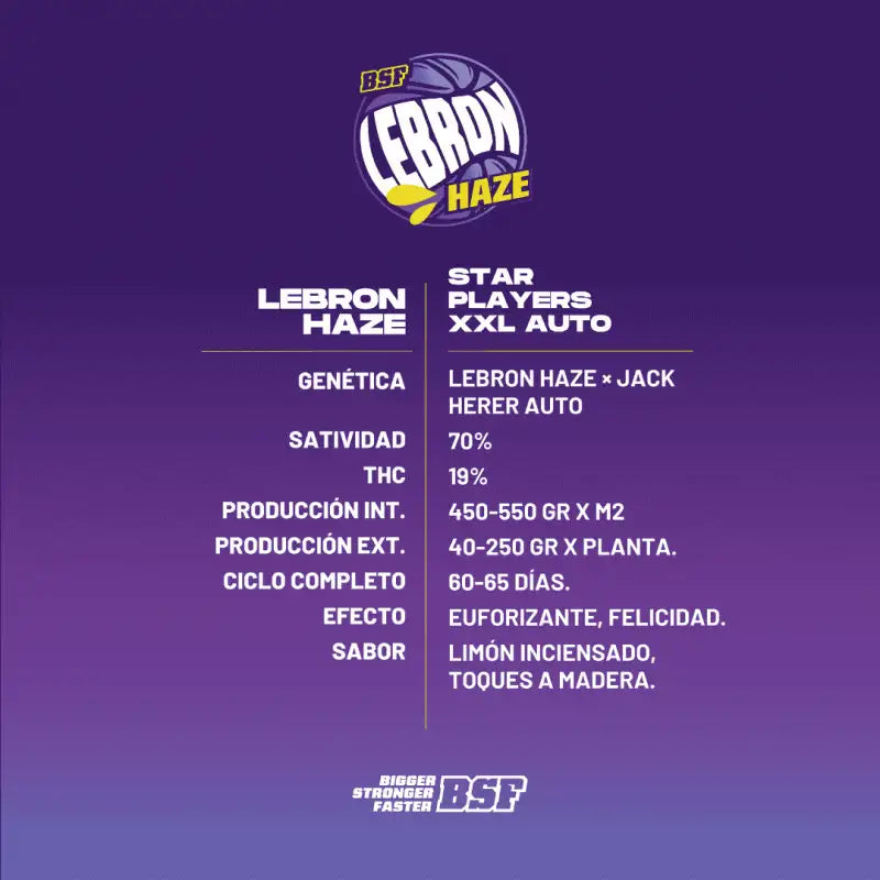 BSF Seeds presenta la versión autofloreciente del jugador sativo más rápido de la liga, Lebron Haze XXL auto. Resultado del cruce de una madre Lebron Haze por un macho Jack Herer de cuarta generación, esta variedad se caracteriza por su satividad y velocidad, manteniendo siempre altos niveles de producción y un bouquet impresionante.