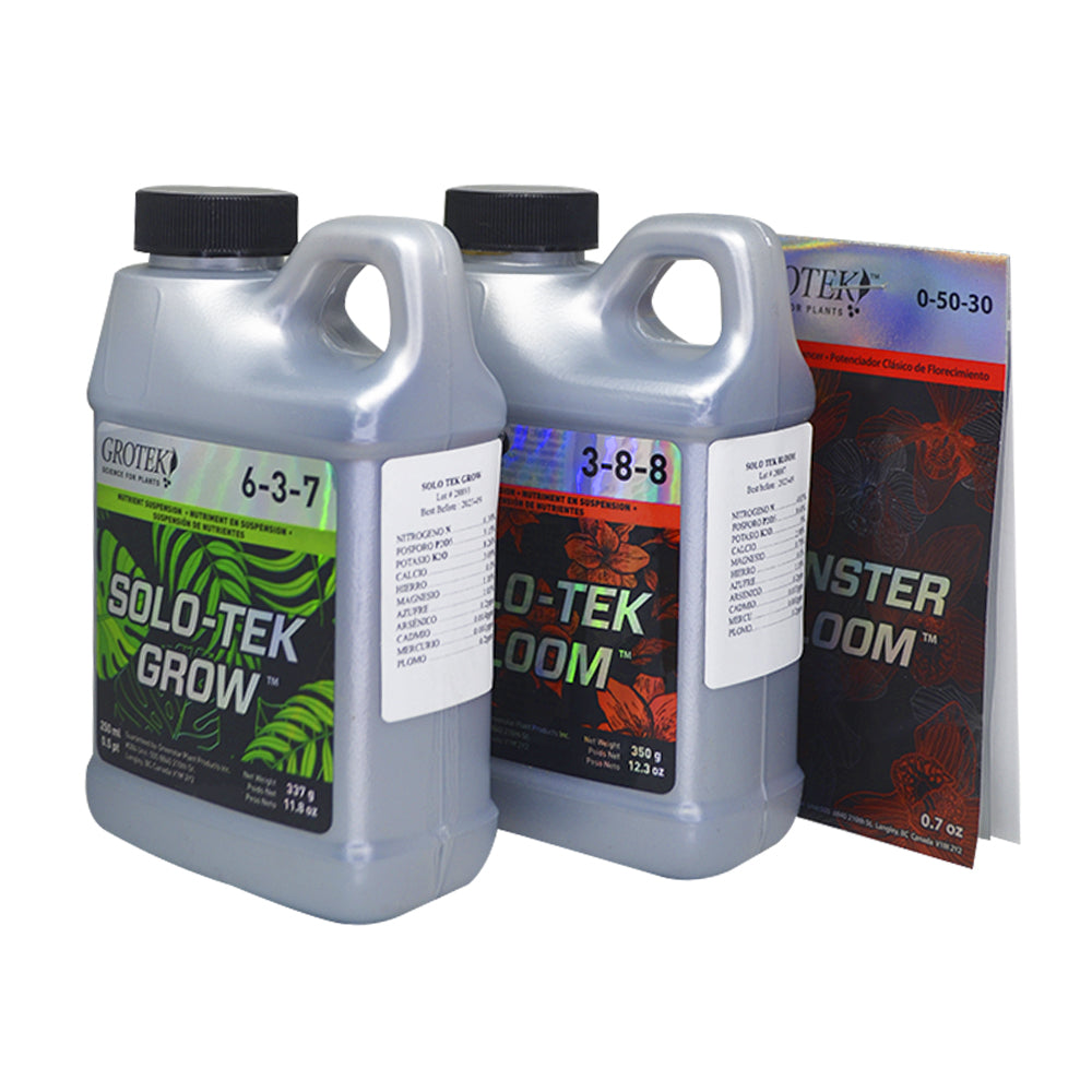 Grotek Micro Pack™ es un gran producto para el cultivador aficionado o casero. Consiste en 3 de los productos internacionales más vendidos de Grotek, que incluyen una botella de 250 ml de SoloTek Grow y SoloTek Bloom, así como una bolsita de 20 g de Monster Bloom. Todos estos productos tienen altos índices de concentración, por lo que este paquete producirá aproximadamente 80 l de solución combinada. SoloTek Grow y Bloom son nutrientes básicos de un solo componente y proporcionarán a sus plantas los macro y micronutrientes esenciales necesarios para mantenerse fuertes y vibrantes. Monster Bloom es un potenciador de flores líder en la industria, que aumenta el tamaño de las flores y las cosechas durante la mitad/final del período de floración.