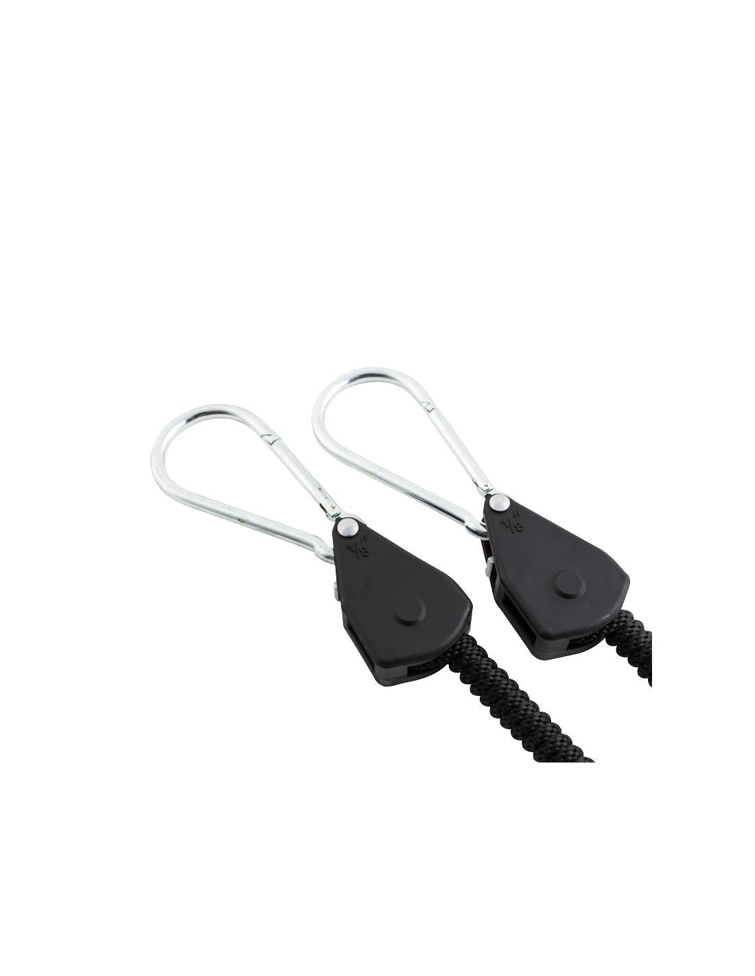Viene integrado un botón de freno para el ajuste del cordón trenzado a la altura que desees y mosquetones inoxidables que resisten hasta 48kg (entre ambos mosquetones).