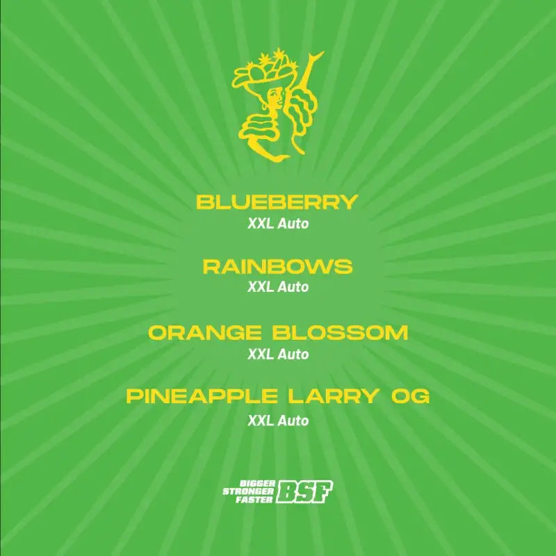Tutti Frutti XXL Auto Mix es una explosión de sabor de 4 de las variedades más frutales de BSF Seeds en su versión automática; Auto Blueberry, Auto Rainbows, Auto Orange Blossom y Auto Pineapple Larry OG. Una increíble mezcla de terpenos separados en burbujas independientes.